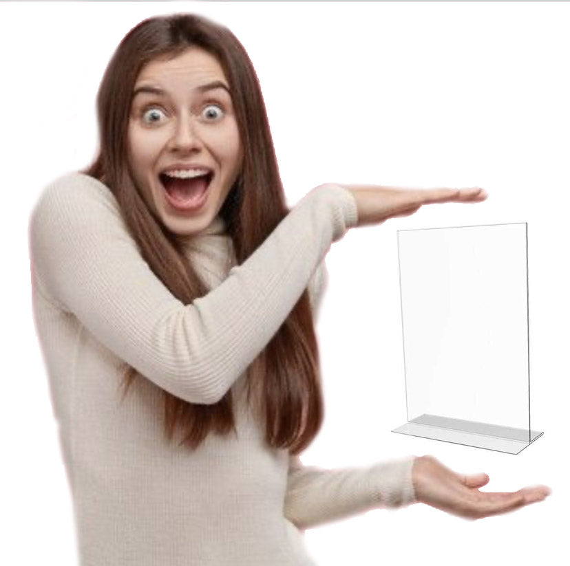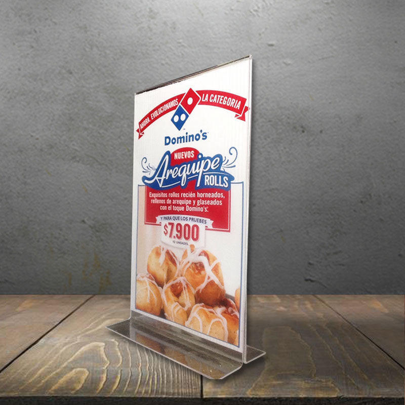 Hablador en acrilico porta menu tamaño Oficio. ideal para oficinas y restaurantes que desean tener informacion que pueden cambiar facilmente a la vista de sus visitantes y clientes